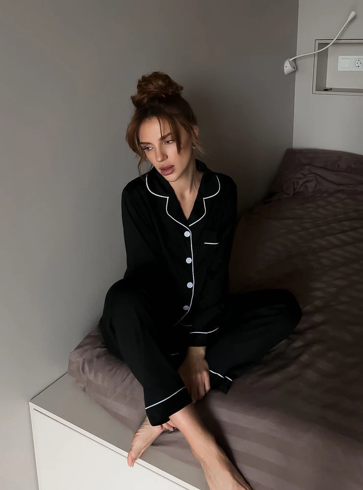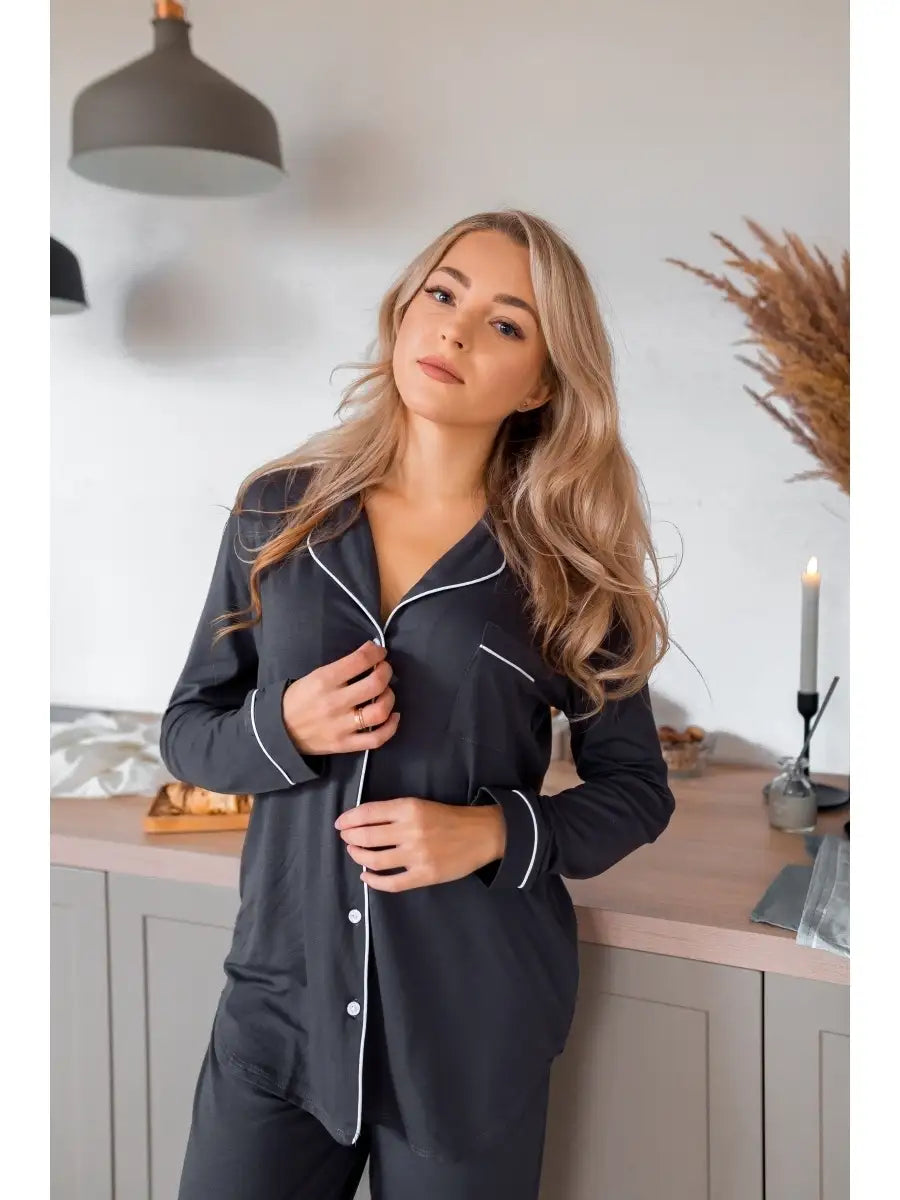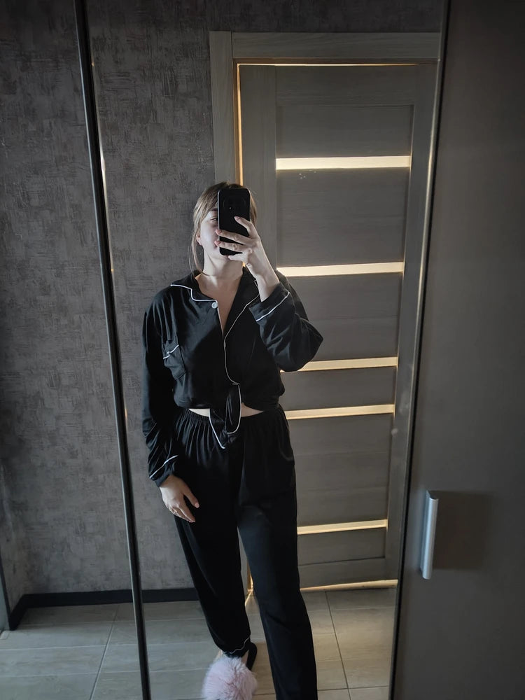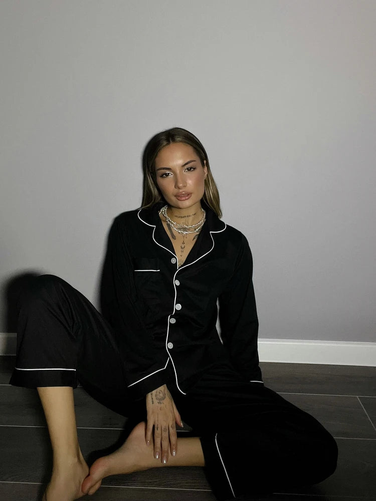 Le haut, à encolure en V et fermeture boutonnée, est rehaussé d’un passepoil contrasté qui apporte une finition raffinée. Le pantalon assorti, à coupe décontractée, est pensé pour être confortable sans jamais perdre en allure, avec une taille élastiquée et des détails coordonnés.