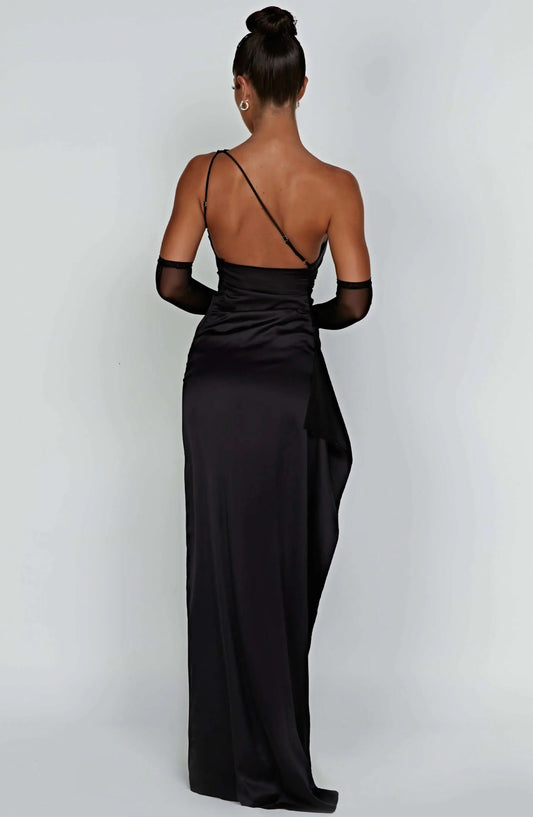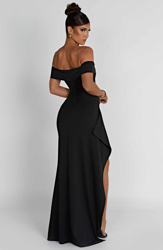 Cette robe définie l'élégance moderne avec une silhouette audacieuse et sophistiquée. Son décolleté plongeant met en valeur le buste tandis que le col halter attaché derrière la nuque sublime les épaules et crée un dos partiellement dénudé pour un effet séduisant. La taille cintrée s'ouvre sur une jupe volumineuse et structurée qui apporte une dimension architecturale à l'ensemble, créant un contraste saisissant avec le haut ajusté.